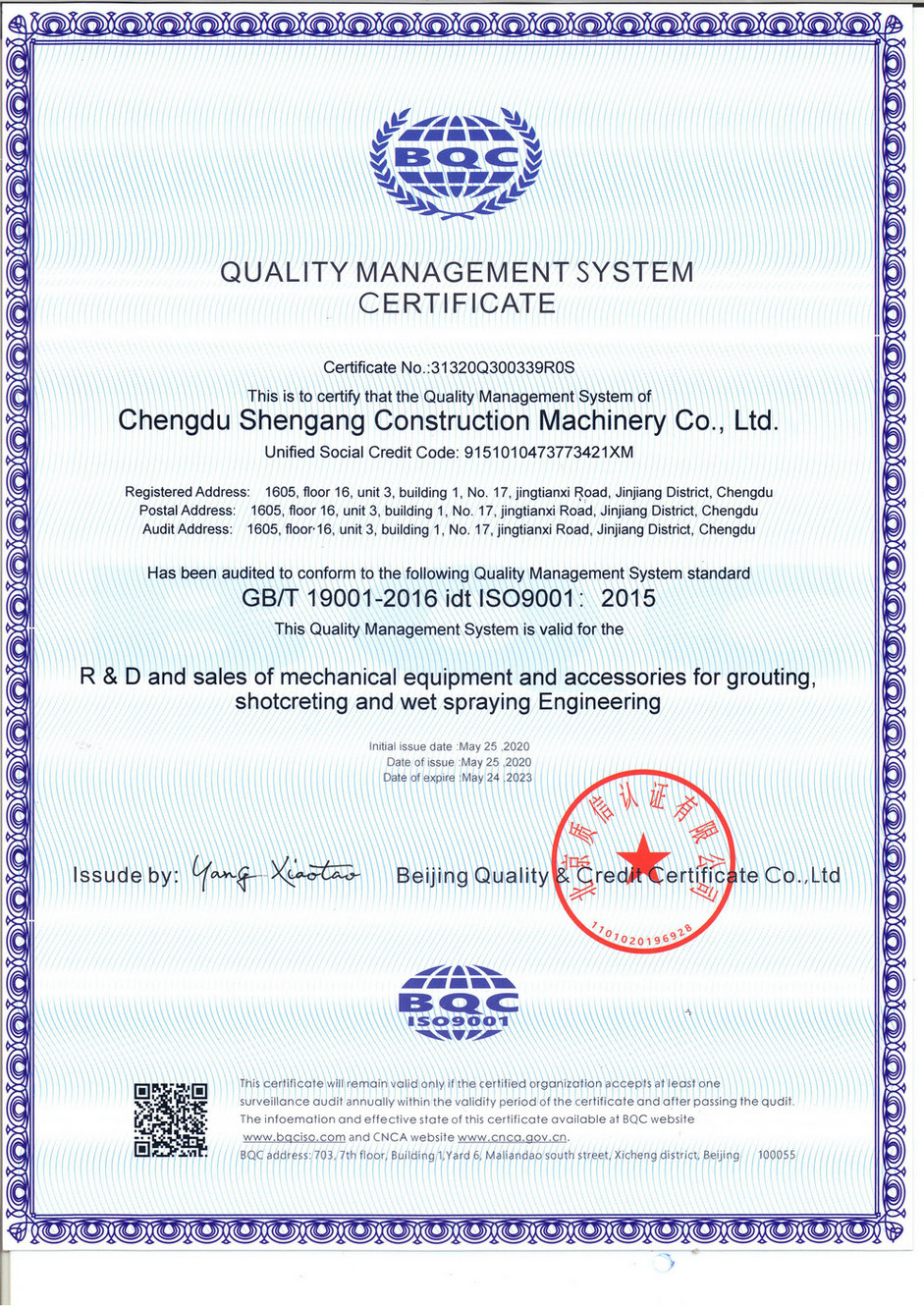 經(jīng)過國家權威機構質量認證中心專家組的全面、嚴格、細致的指導和審核,確認成都申港工程機械有限公司質量管理體系符合GB/T19001-2016 idt ISO9001:2015標準,并于2020年5月25日向我公司正式頒發(fā)了ISO9001質量管理體系認證。