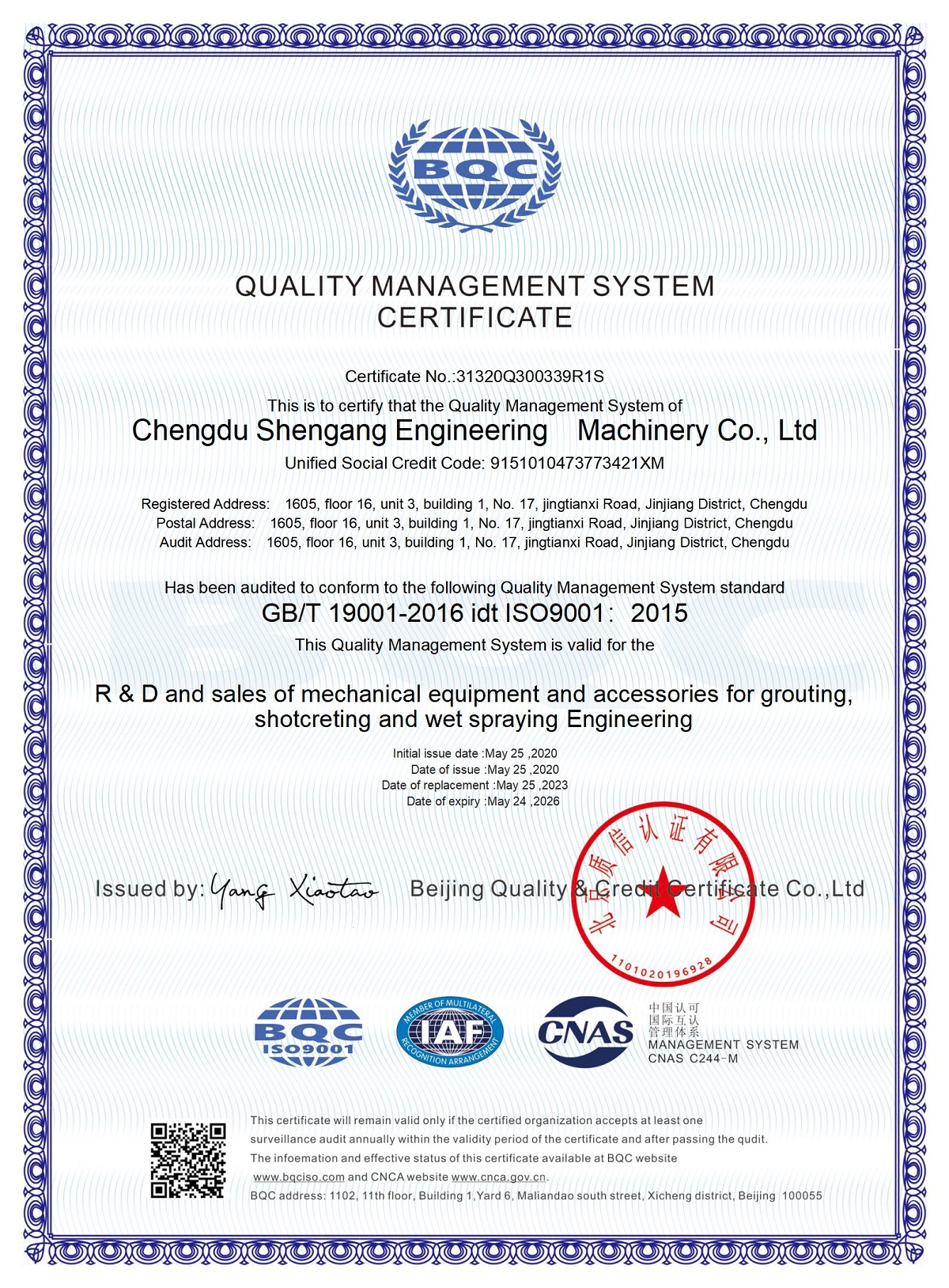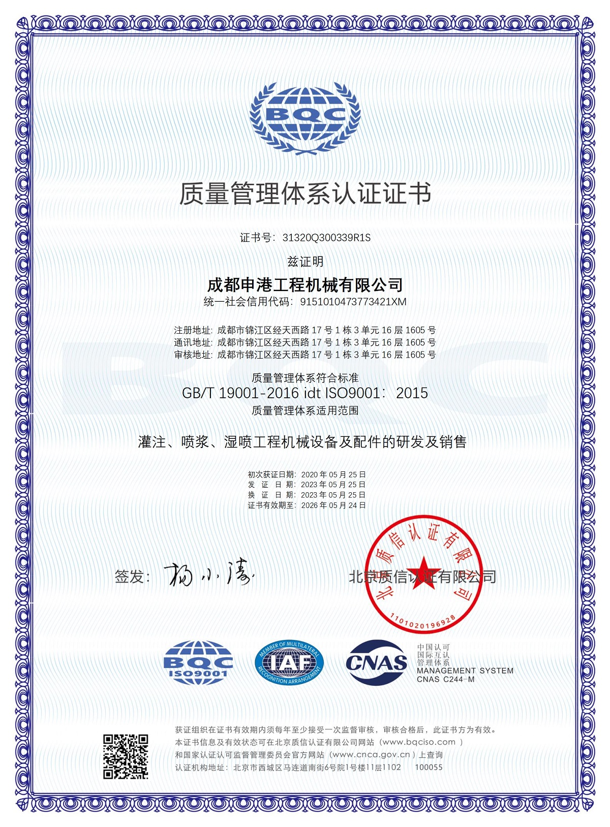 5月25日,成都申港工程機械有限公司完成《質(zhì)量管理體系認證證書》換證工作,標志著成都申港公司質(zhì)量管理體系工作再次得到中國質(zhì)量認證中心關(guān)于ISO9001質(zhì)量管理體系的認證和審核。
